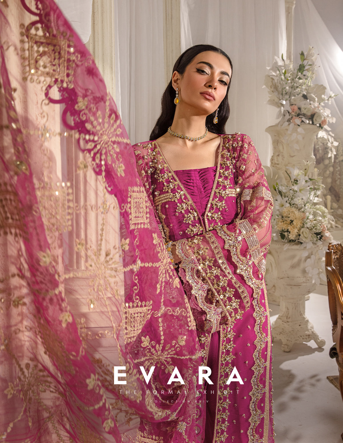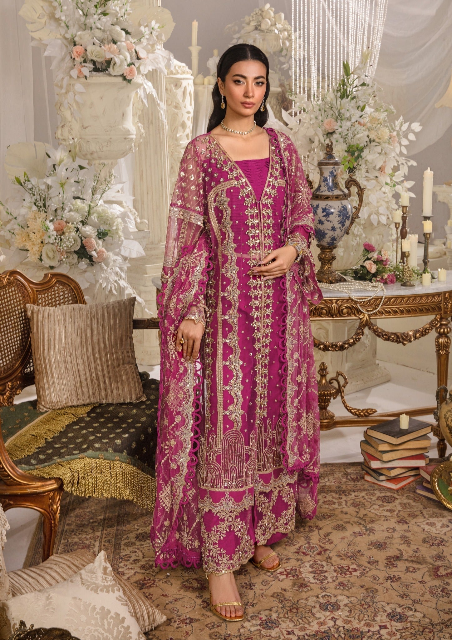 Step into elegance with Magenta Muse, a captivating magenta-hued unstitched luxury formal dress. The ensemble features hand-embellished embroidery on delicate poly net fabric, creating an enchanting aura. Complemented by an intricately embroidered dupatta and solid dyed raw silk inner and trouser, this outfit is perfect for any grand occasion. Its modern yet traditional design ensures a graceful and stylish look.