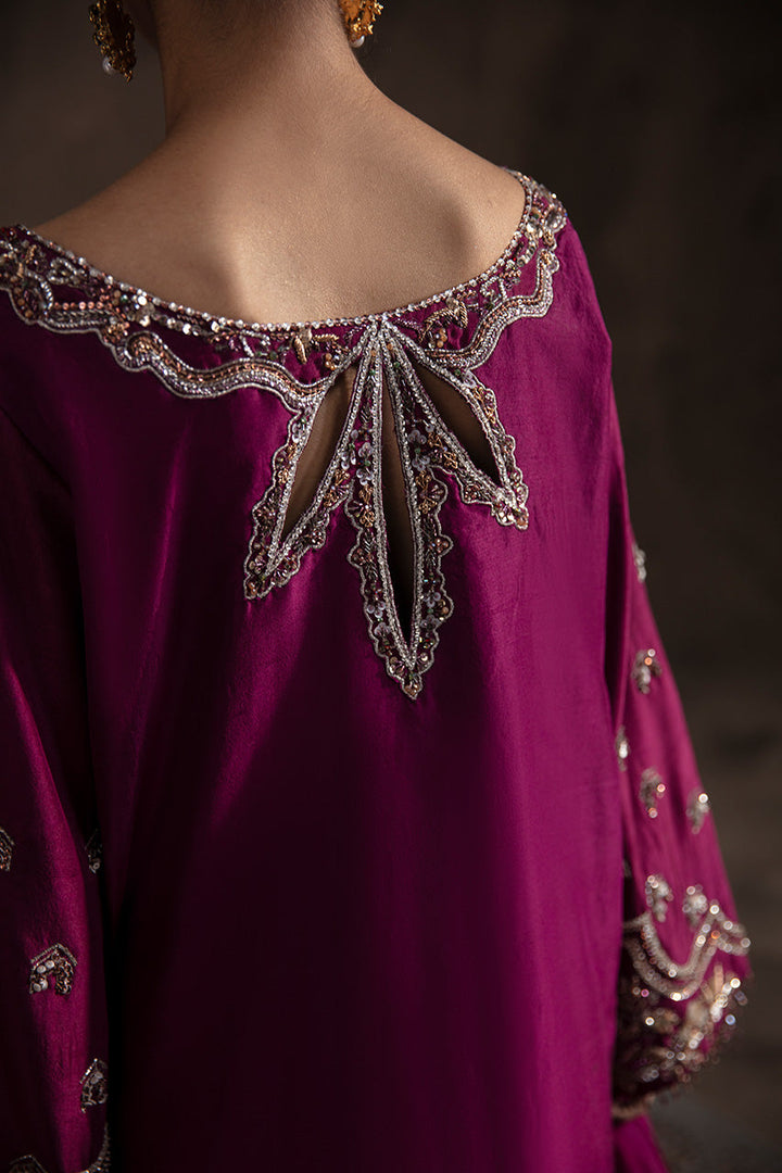 A classic burgundy shalwar kameez featuring wide open sleeves adds a touch of regal charm, while intricate floral trellises adorn the kameez front and back, shimmering with handcrafted gold, copper, and silver tone embellishments. Each stitch, delicately woven with cora, tilla, and dabka, tells a story of exquisite craftsmanship. To complete the look dyed organza dupatta comes along.