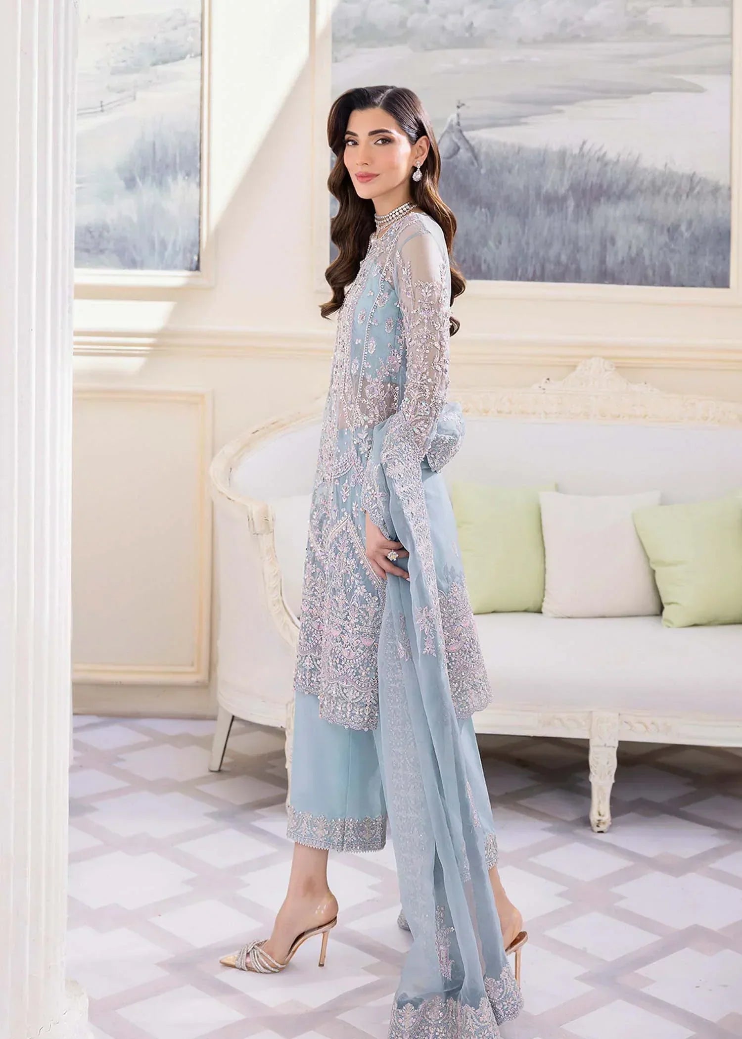 The ice blue mid-length shirt is a vision of elegance, exuding sophistication with its delicate embroidery and shimmering silver embellishments. The intricate patterns and motifs dance across the design, creating a mesmerizing tapestry of beauty that catches the light with every movement. This shirt embodies timeless charm and refined grace, making it the perfect choice for any special occasion. This shirt is paired with the culottes pants, which add a modern flair to the ensemble. The normal bottom silhouette offers both comfort and style, while the tailored fit ensures a flattering look. The pants perfectly balance the feminine elegance of the shirt, creating a harmonious and chic outfit that is both sophisticated and contemporary .Completing the ensemble is with the embroidered dupatta, the dupatta ties the outfit together seamlessly.