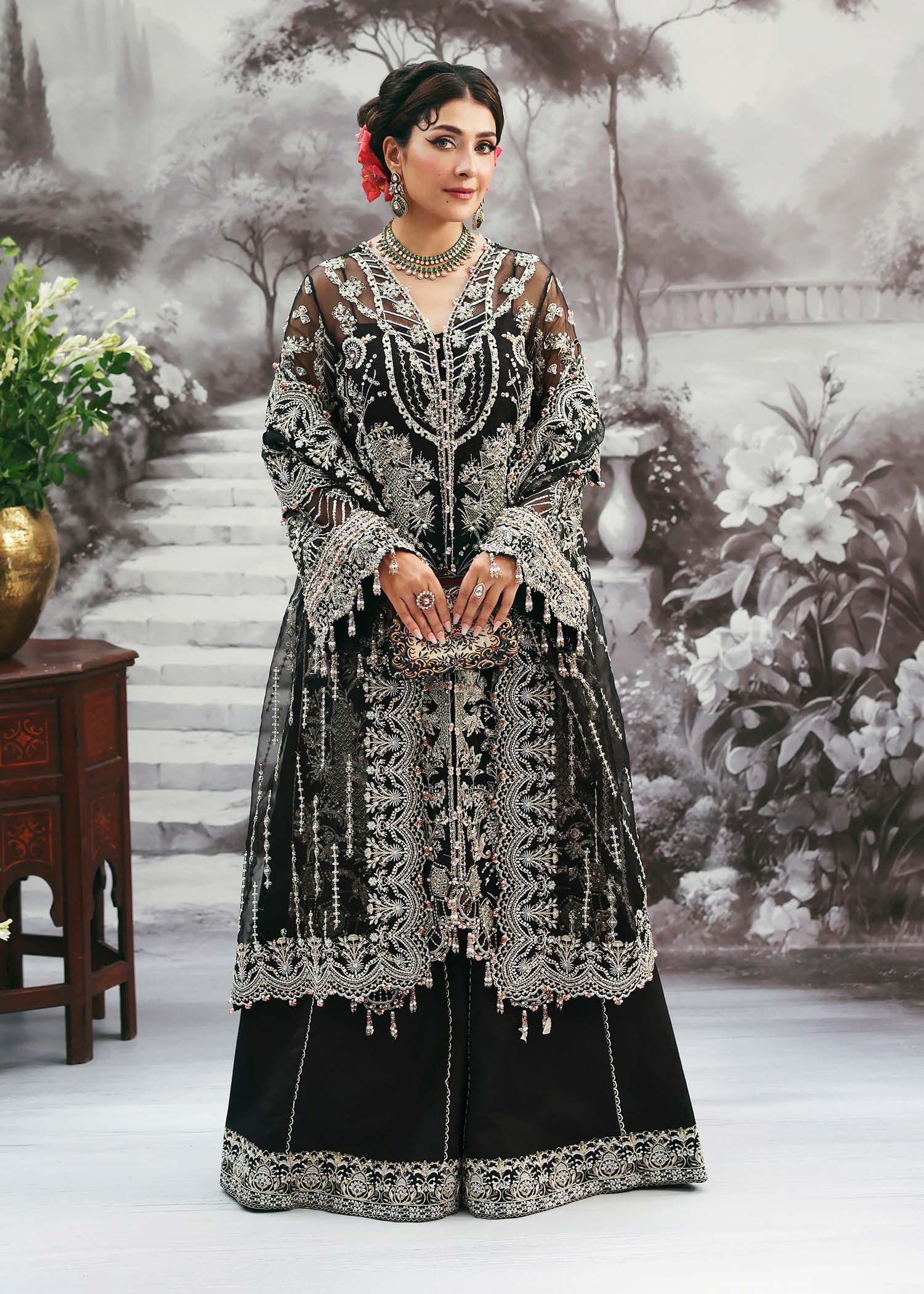 Command attention in this majestic onyx noir ensemble, a celebration of timeless elegance with a dramatic edge. The outfit features hand-embellished organza panels with scalloped detailing, elevated by intricate embroidery and refined borders that exude luxury. An intricately worked dupatta adds grace and sophistication, while the tailored trouser and inner ensure a sleek, refined finish. The design is further accentuated with a delicate silver sequin spray and masterful adda work, creating a luminous statement perfect for evening festivities.