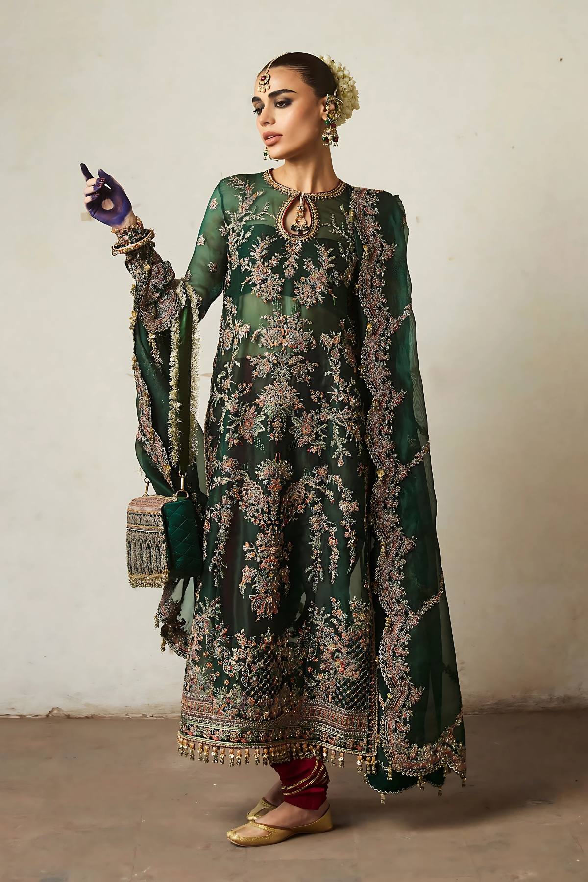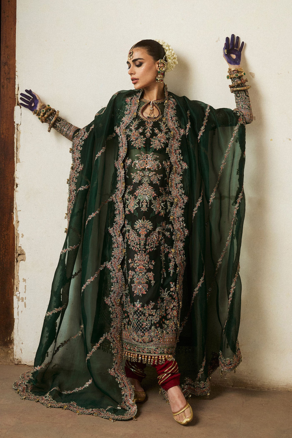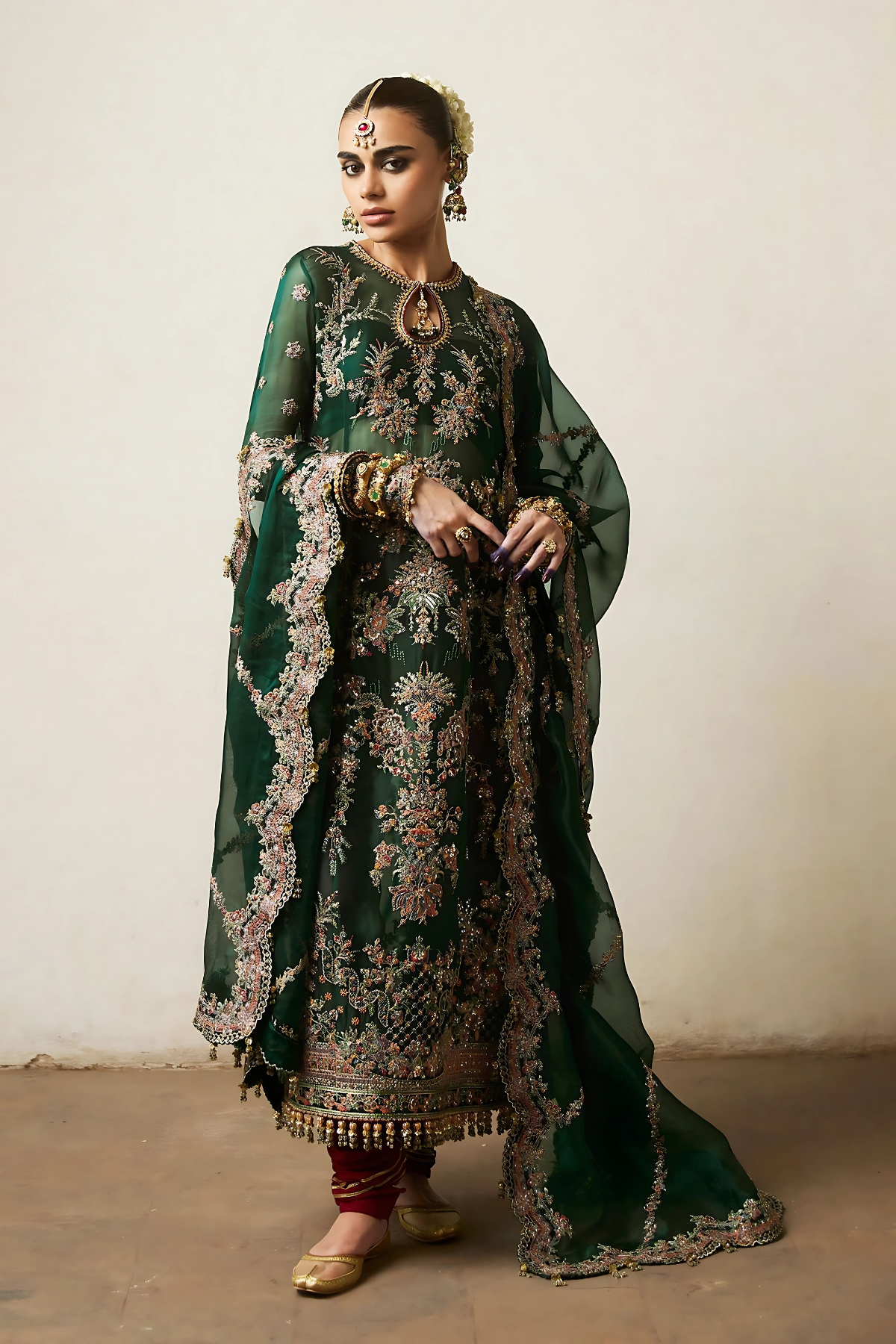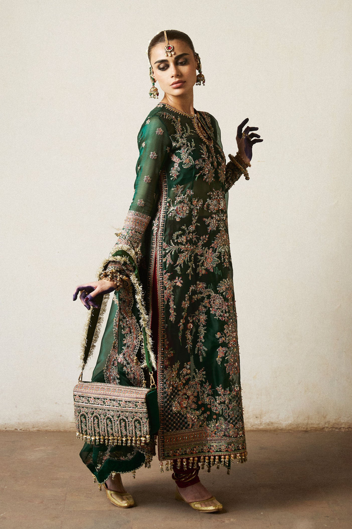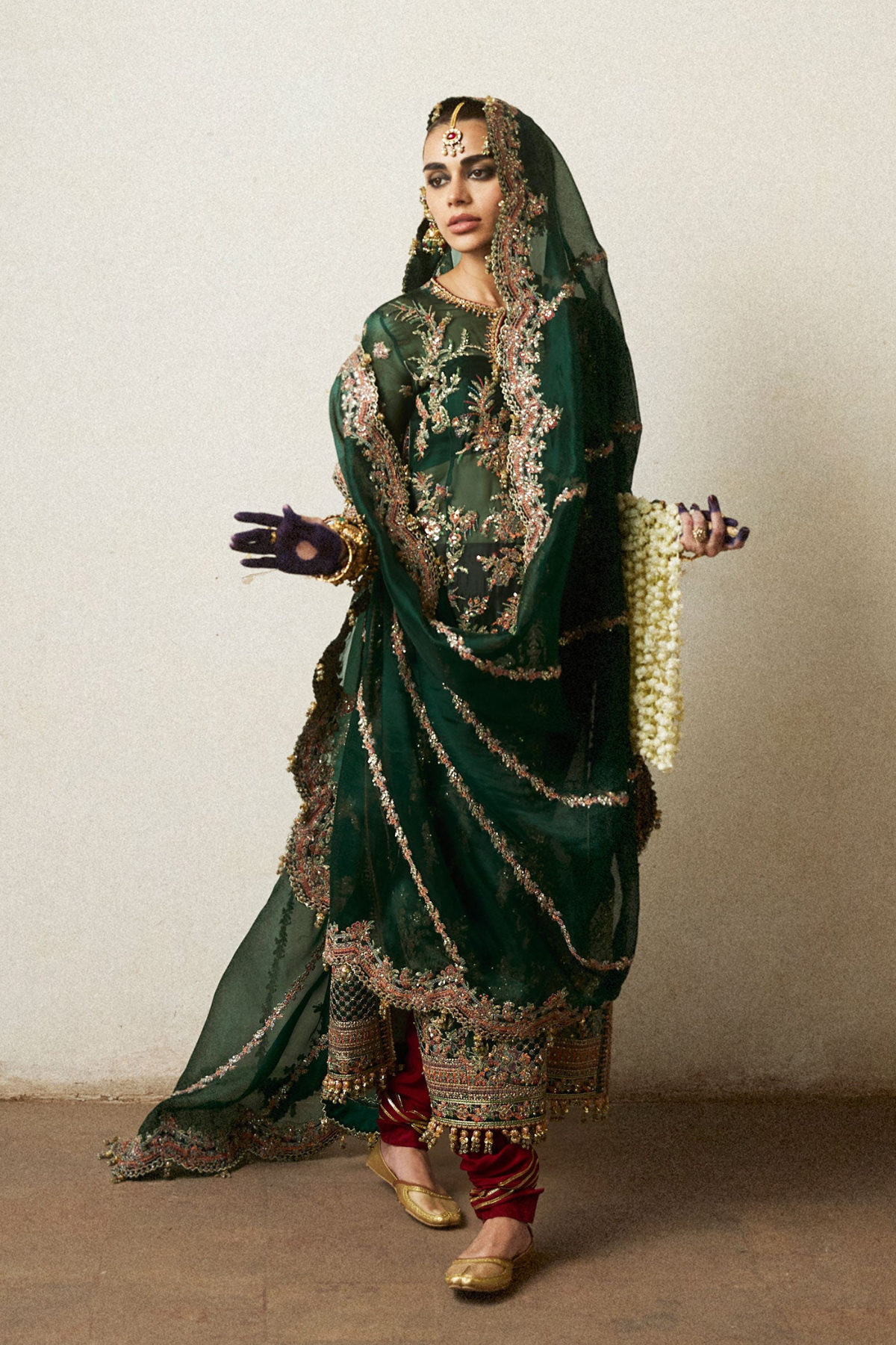 This luxurious formal dress features a beautifully embroidered and hand-embellished organza long shirt paired with rich maroon Korean raw silk trousers, exuding a perfect blend of tradition and modernity. The matching organza dupatta is gracefully adorned with diagonal embroidered lines and scalloped four-sided borders, adding sophistication to your look.
