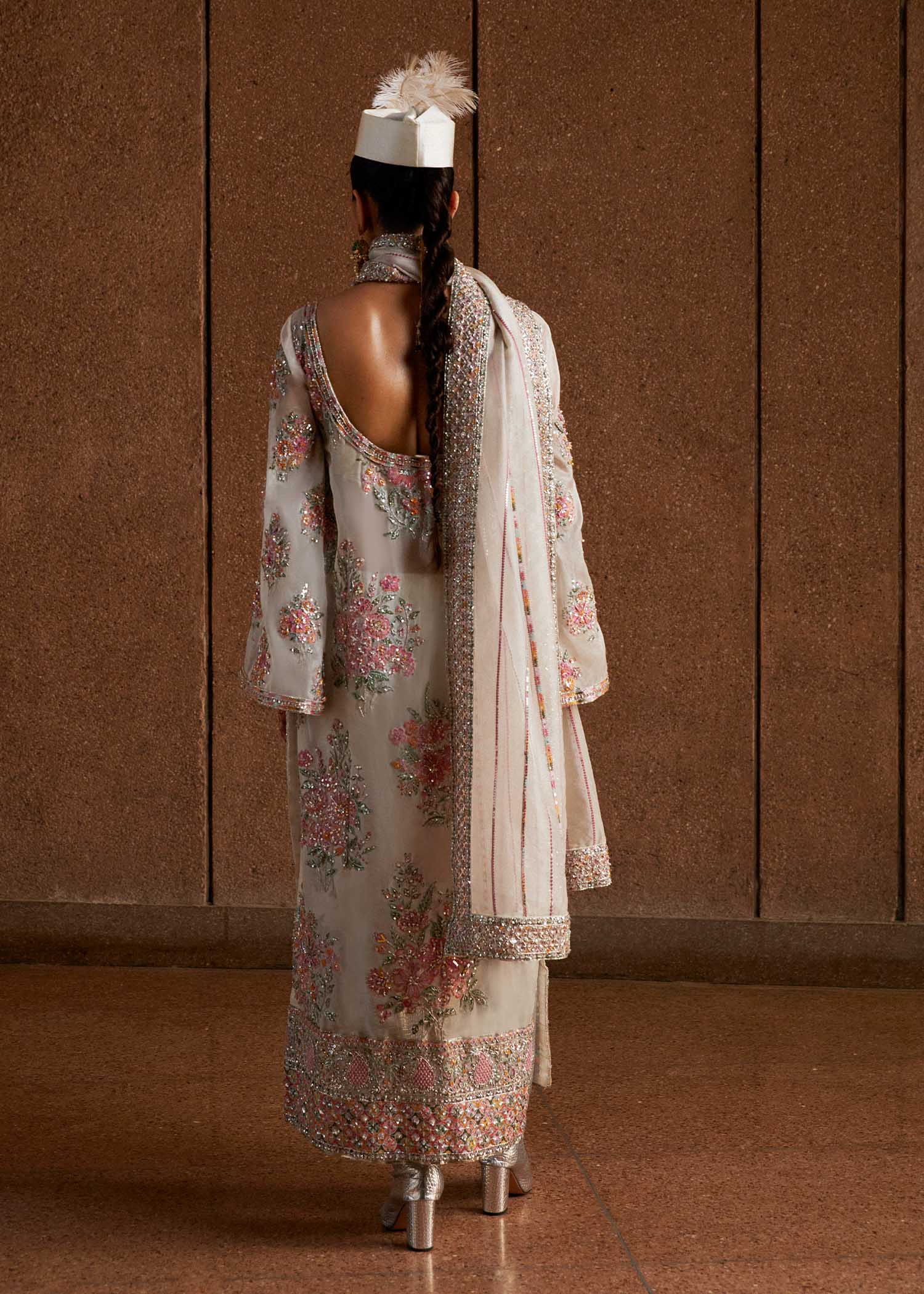 A perfect illustration of dazzling hues features stunning Ivory organza shirt with floral bunches embellished with intricate handwork details of sequins, resham, nakshi and dabka along with korean rawsilk choridar. Paired with a detailed embroidered organza duppata enhanced with intricate handwork details on four side border, setting a timeless appeal.