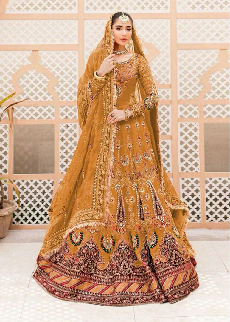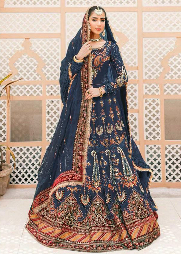 A mughal inspired Lehnga Choli constructed with meticulous handwork using dabka, kundan, zari and extensive velvet patch work laden with emerald green stones. Dupatta is enriched with mukesh work with hand embellished head border and three sides embroidered border with all around suchi kiran finishings.