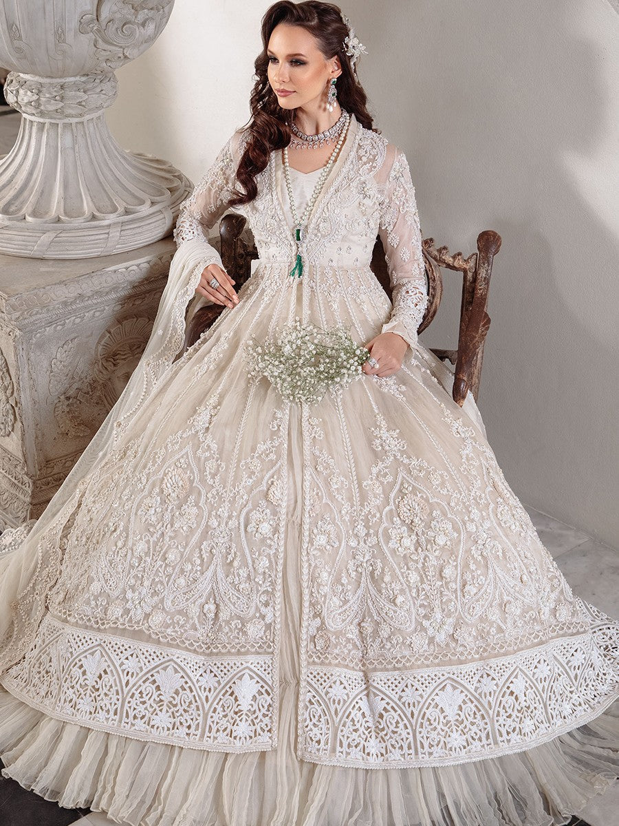 The dreamy White on White front open gown with delicate floral designed patterns and hand placed sequins, pearls, crystals combined with meticulously composed embroidered sleeves with cut work details and frilled edgings along with a peeping through tulle based ruffled lehnga.