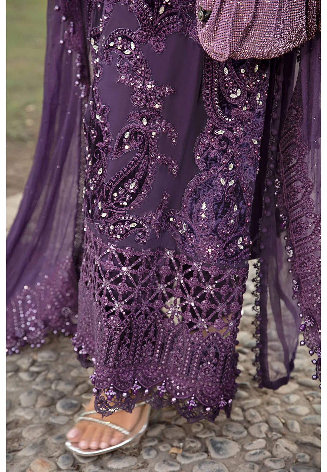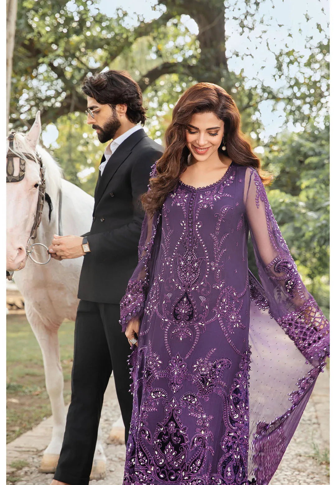 Step into elegance with this stunning purple formal wear ensemble. Crafted with intricate embroidery and delicate embellishments, this outfit is designed to make you stand out at any event. The luxurious fabric drapes gracefully, while the rich purple hue adds a regal touch. The matching dupatta flows effortlessly, complementing the detailed craftsmanship of the dress. Perfect for weddings, formal dinners, or evening parties, this outfit is sure to make a lasting impression.