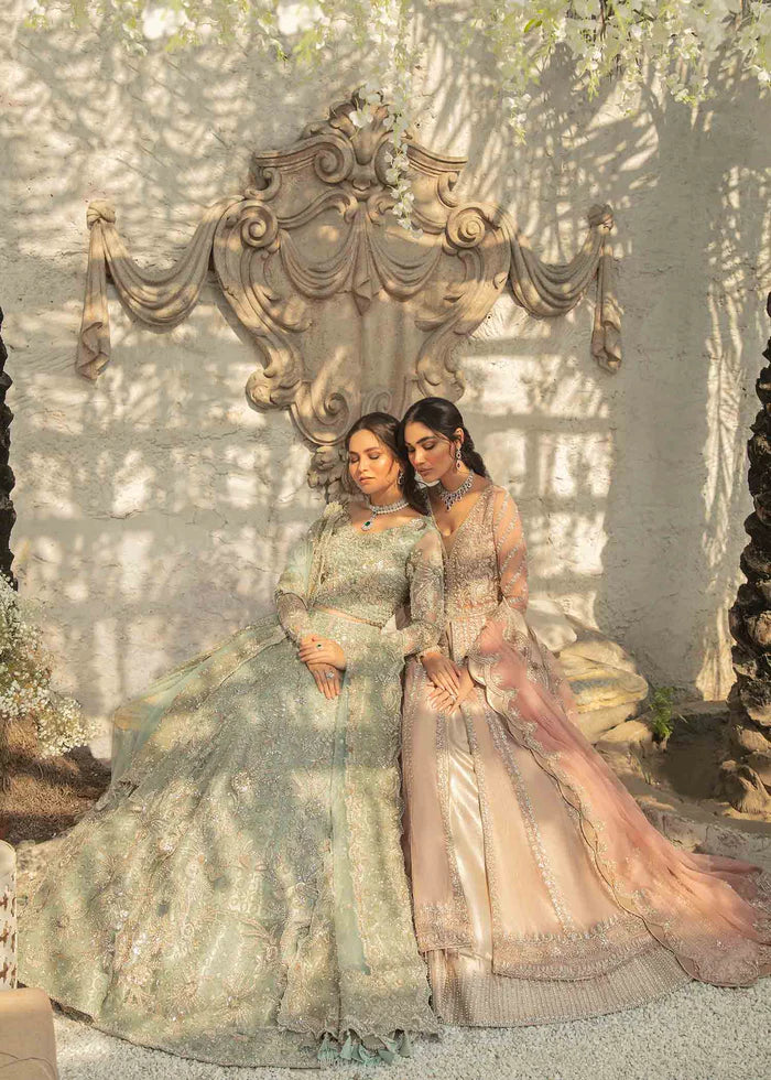 Description: Toe Kiss length blush pink Net gown embellished with dramatic merge of rose Gold and silver naqshi dabka floral pattern has no shortage of intricate hand work details. Oxidized rose Gold tone tissue lehnga crafted by highly skilled technique along four-sided hand embellished scalped running boarder on net dupatta complete the silhouette.