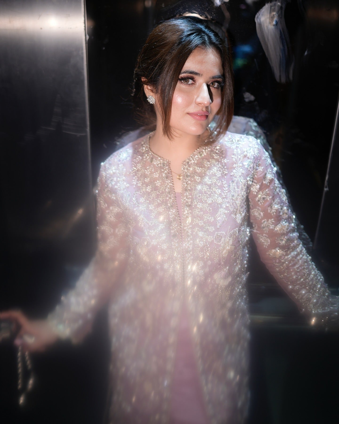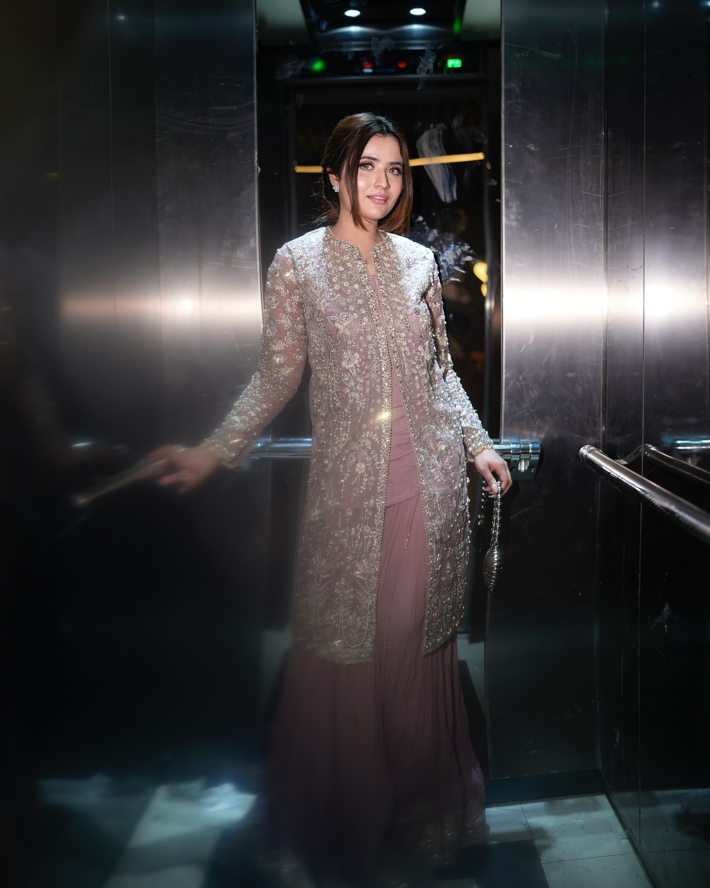 A perfect embodiment of celebration, ‘Sehr’ a graceful ensemble, featuring the timeless charm of dusty mauve. This lavishly adorned Organza Jacket and airy drape dupatta with enchanting screen print, is skillfully adorned with intricate hand embellishments work, pairied with a Crushed Sharara, adding a touch of traditional work.