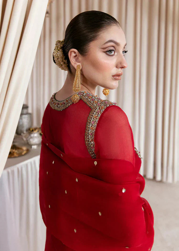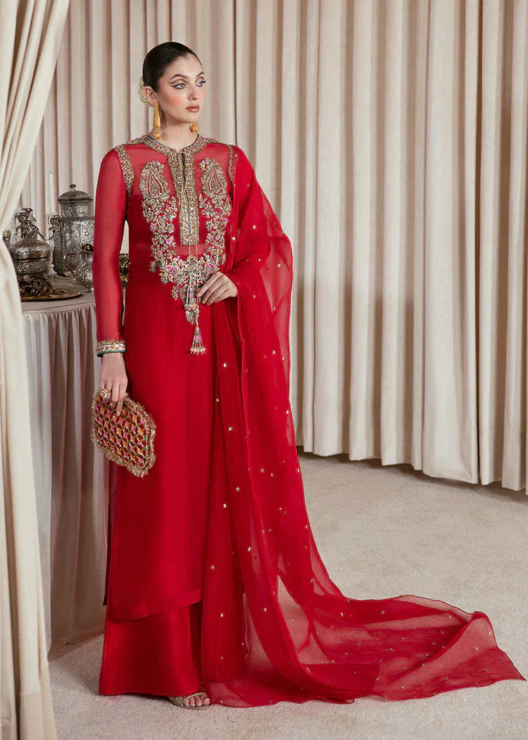 An absolutely regal red organza shirt with embellishments in the front of nakshi, dabka, sitara, and cutdana in multicolor. It comes with a satin slip. The outfit consists of red raw silk palazzo pants with pockets and an organza dupatta with dequin chatta on it.