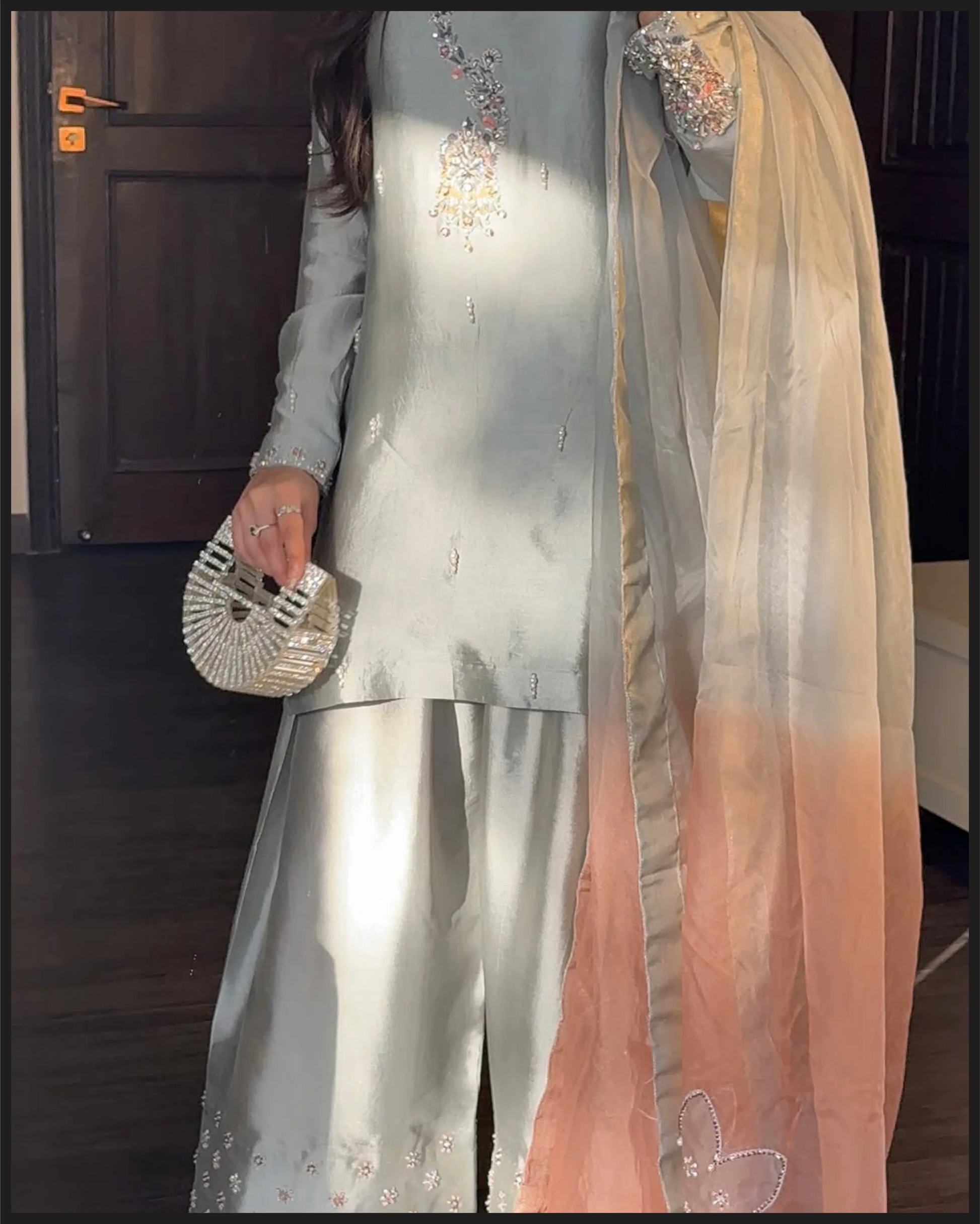 Experience exquisite craftsmanship with our handmade farshi shalwar, featuring highly intricate adda work. Complete the look with a beautifully handpainted dupatta. Elevate your style with this unique and elegant addition to your wardrobe.