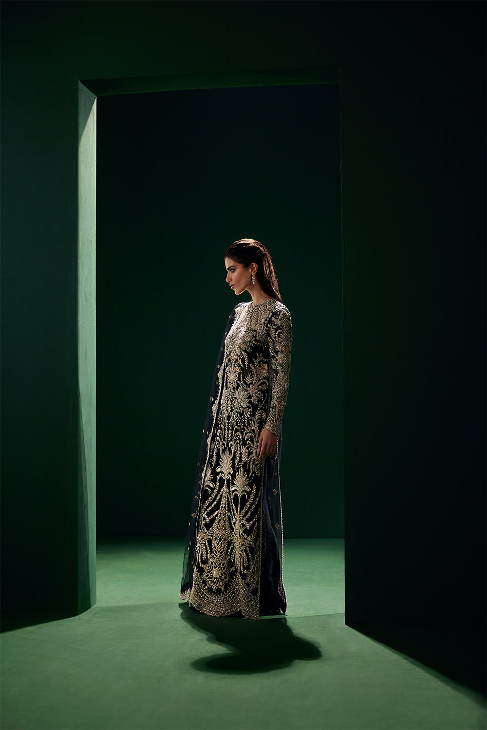 The "Éclat" ensemble is the epitome of sophistication, featuring a sleek black mock-neck shirt crafted from fine net fabric. This elegant shirt is adorned with delicate chandi (silver) embellishments, gracefully flowing across the front and back, creating a mesmerizing effect. Paired with flared trousers with intricate scalloped cutwork and a matching, opulent dupatta, this outfit is perfect for making a statement at any special occasion.