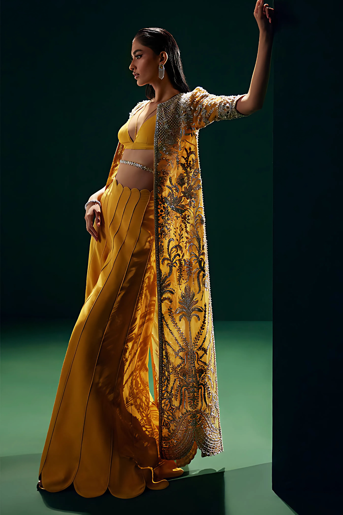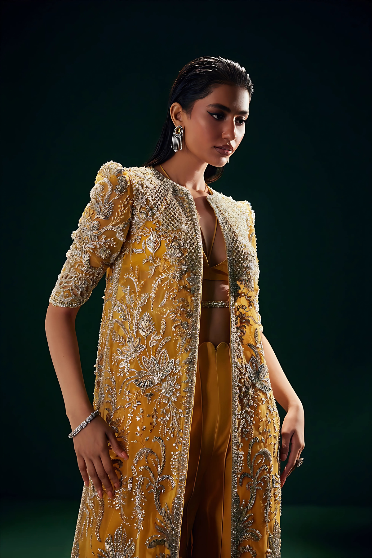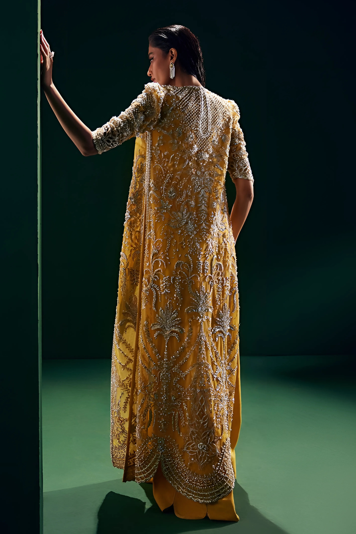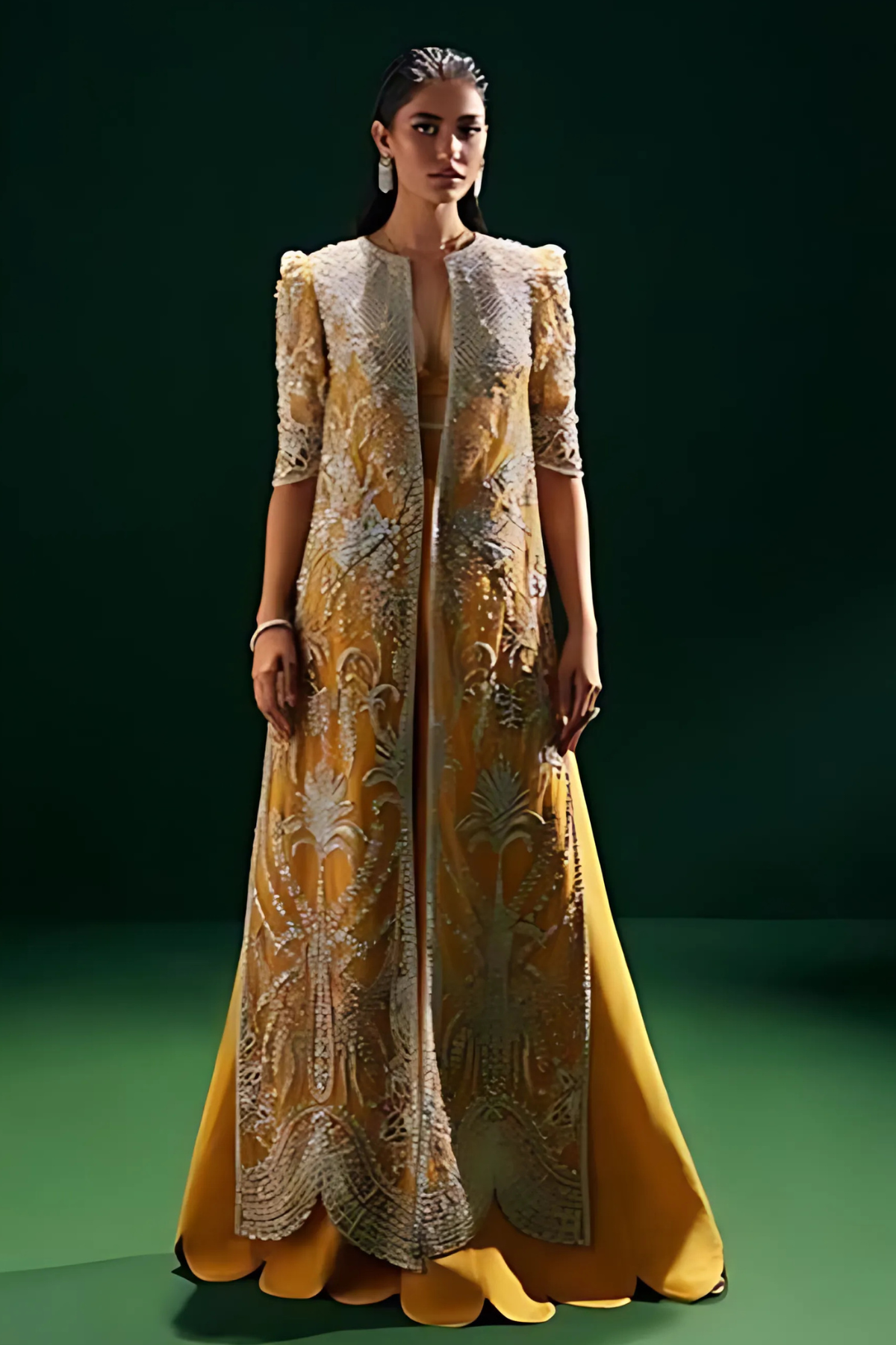 This unstitched masterpiece features a breathtaking Tuscany saffron net long jacket, adorned with intricate dabka and seesha work in a mesmerizing floral pattern. The delicate scalloped hem and puffed mid-length sleeves enhance its timeless charm, making it a perfect choice for those seeking elegance and sophistication.