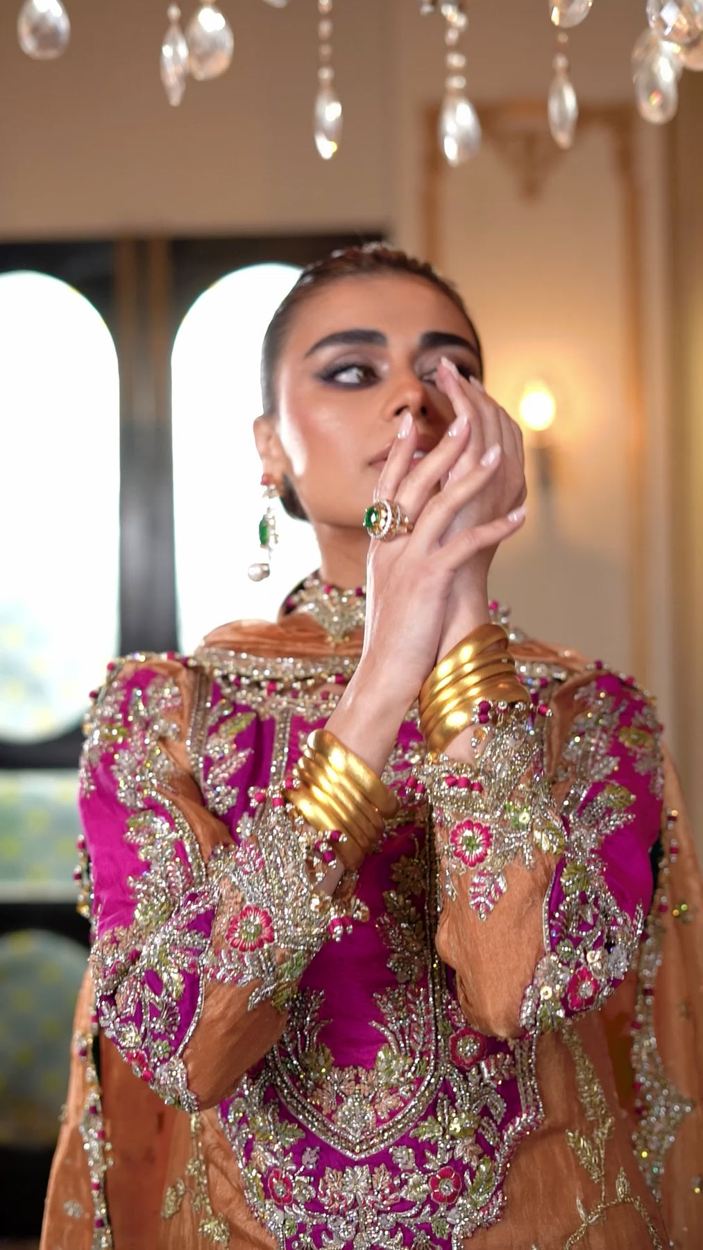 In the dimly lit room, SULTANIQUE emerges like a spectral bloom created with pure tissue in pale tangerine tone adorned with ethereal floral motifs paying homage to tales of ancient traditions. The ensemble celebrates old school elegance with each taanka laden carefully on the eclectic appliques creating a myriad of colors amalgamating convention with modernity. The turquoise green raw silk pants break the monotone of color and fabric exuding festivity and a mood of color and happiness.