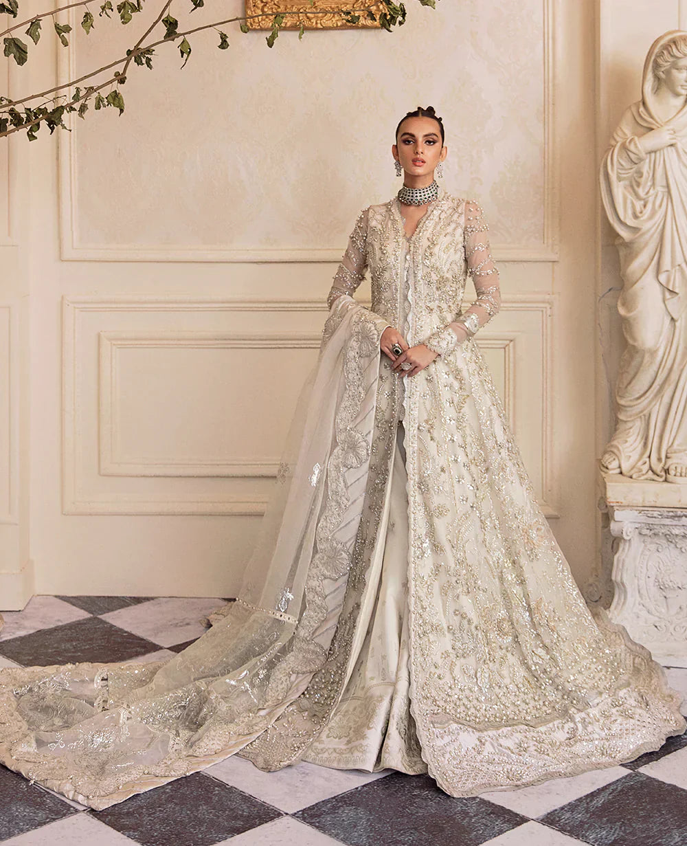 Detailed florals bloom in moonlit tendrils on the dreamy ivory organza canvas of “Un Pavot”, luxuriously laden with iridescent sequin, sparkling crystal and oyester pearls with dabka work creating an ethereal impact. Paired with an ivory organza foil print dupatta emblazoned with filigreed bootis, elaborately detailed borders and dramatically accented pants, this look is reminiscent of royal regalia and a perfect choice for any and all formal occasions.