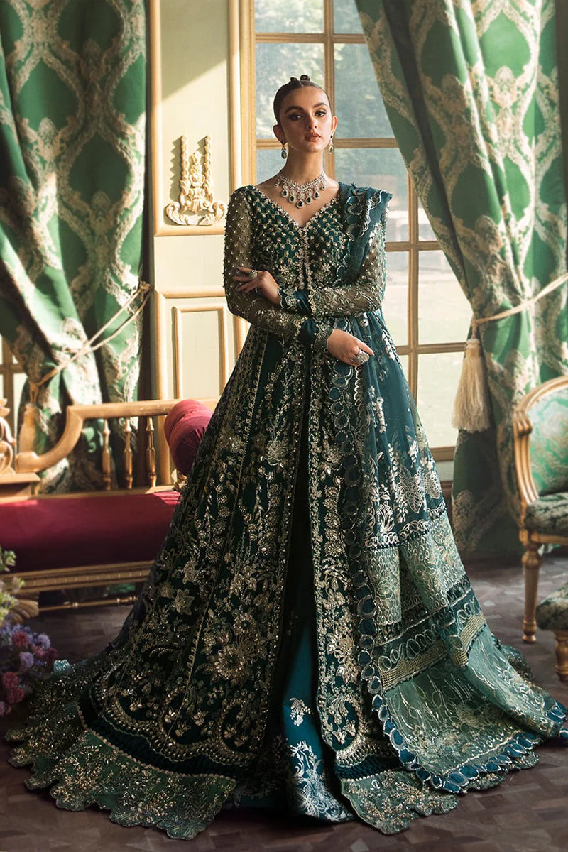 Glide your way through the festive season in mesmerising glamour clad in the meticulously crafted ‘Une Jacinthe’. A classic teal ensemble with an intricately adorned bodice with a classic V neck is clenched to a panelled shirt is fully encrusted with handwork bellishments, shimmering crytals, pearls and Swarovskis placed in stunning floral array. Worn over an embellished panelled lehanga. Paired with a teal organza foil printed dupatta with sequined scallope border; this ensemble is a statement par excellence.